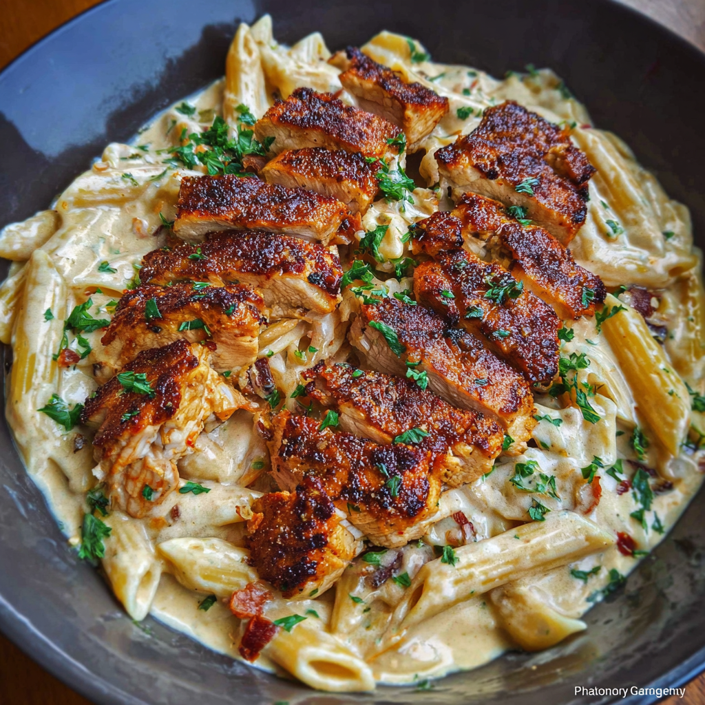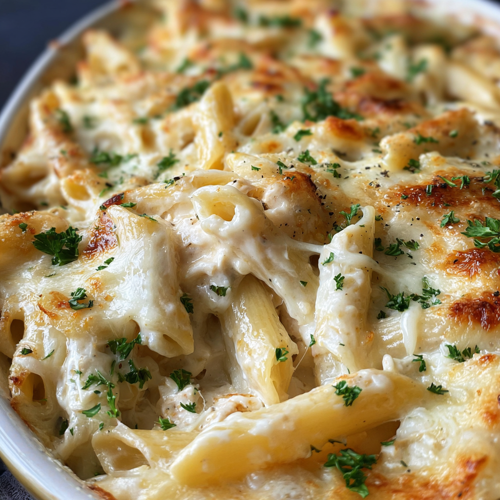 Kremowy makaron penne w sosie Alfredo otula wszystkie składniki w wyjątkowy sposób, tworząc apetyczną zapiekankę, która zachwyci podczas rodzinnych obiadów.