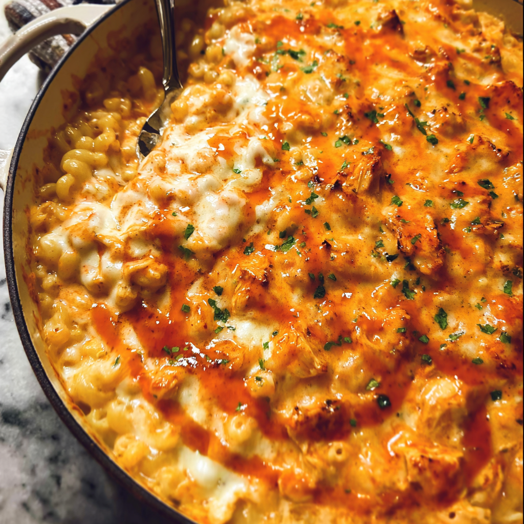 Zapiekanka z kurczakiem Buffalo i makaronem z serem to doskonałe połączenie pikantności i kremowej tekstury, które zachwyci smakoszy na każdej imprezie.